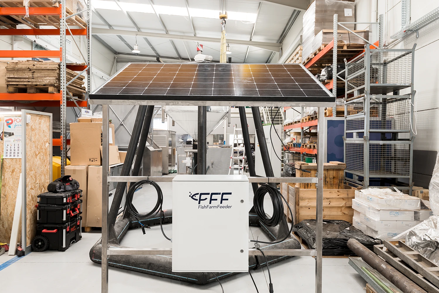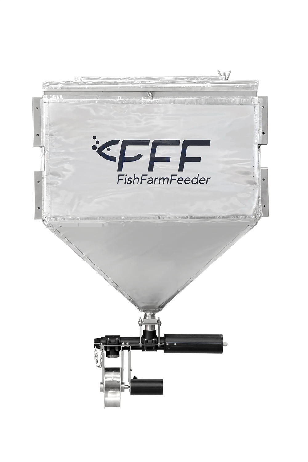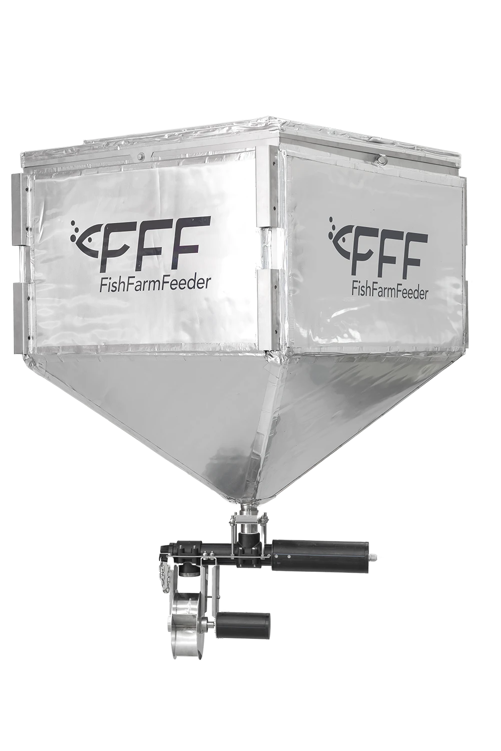 Feeding with extruded, pelletized, or spherized pellets. Custom-built in stainless steel with 1 silo of 1 m³. High-precision dosing using screw conveyors sized according to dosage requirements. Diluted-phase feeding with spreader. Solar panel and batteries providing 2–3 hours of autonomy.