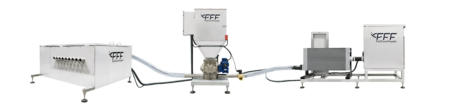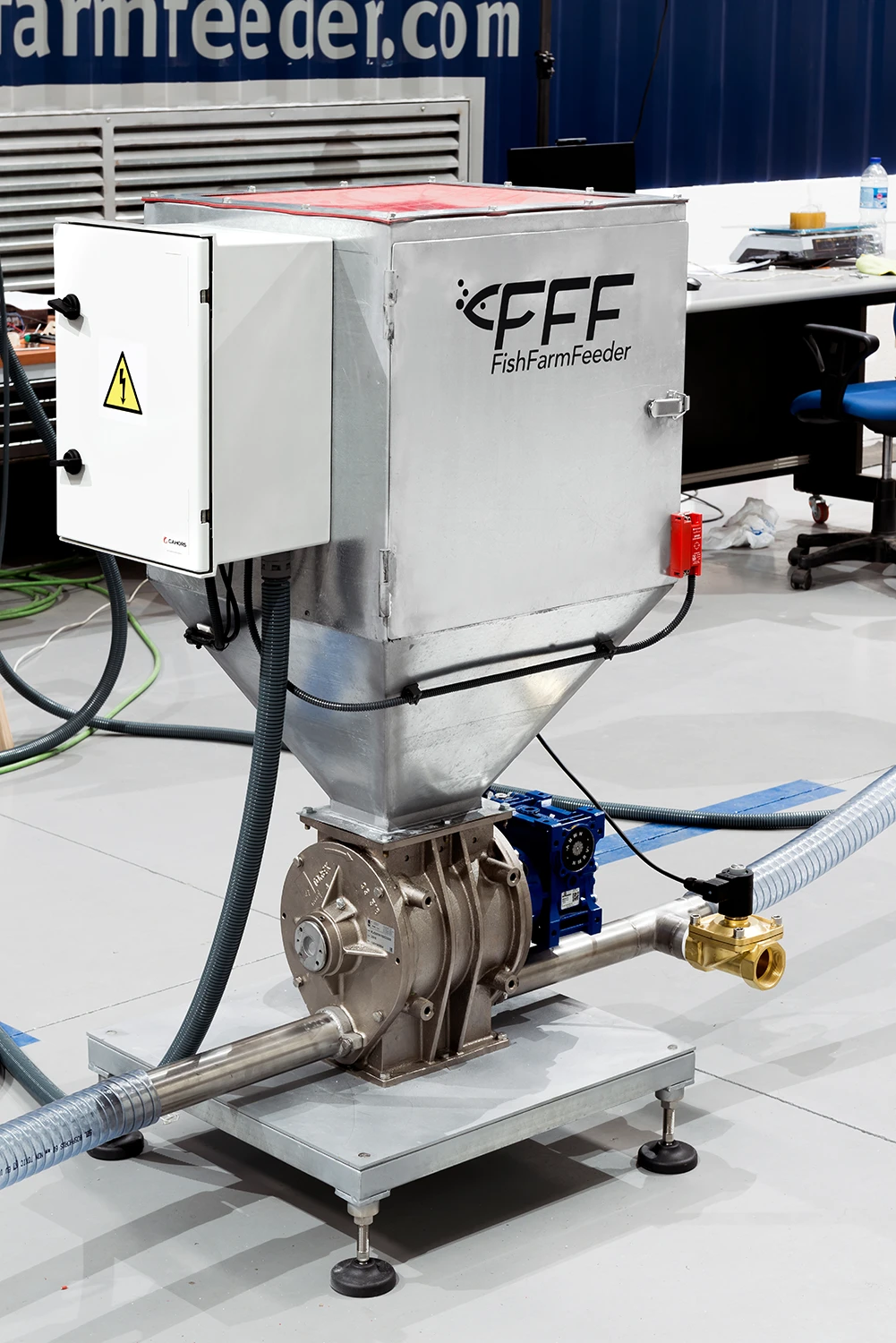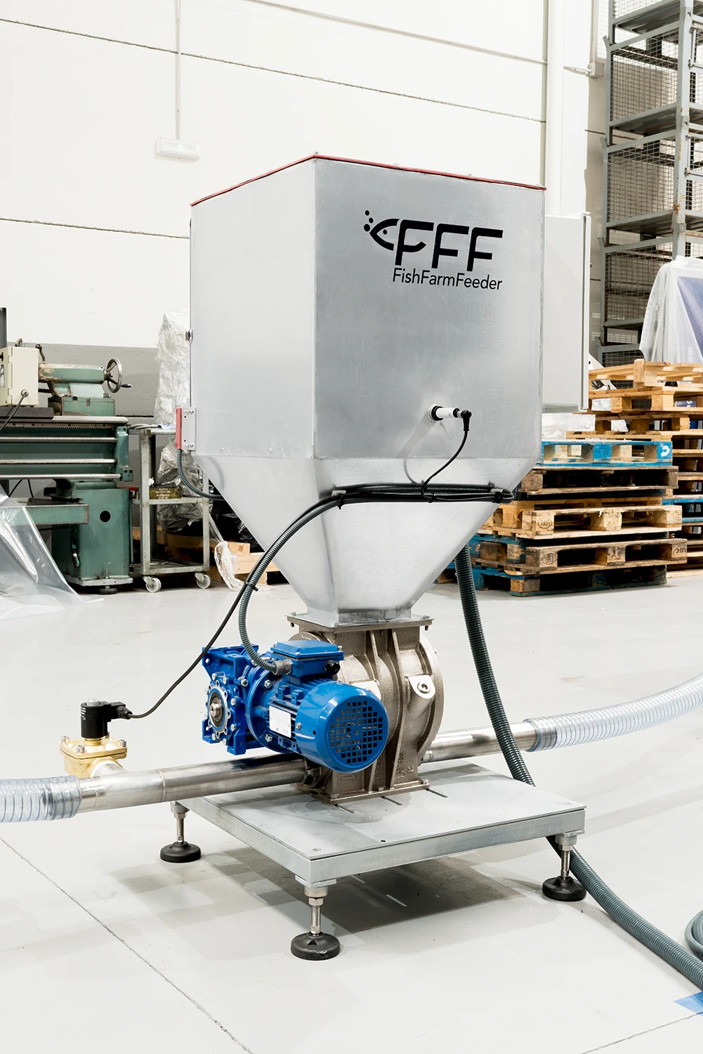 Feeding with extruded, pelletized, or spherized pellets. Custom-built in galvanized steel with 1 intermediate silo connected to high-capacity silos via included screw conveyors, supplied by other manufacturers. Diluted-phase feeding using a rotary lobe air blower. Aqua3F software for complete management of dosing, species and feed traceability, and feeding history.