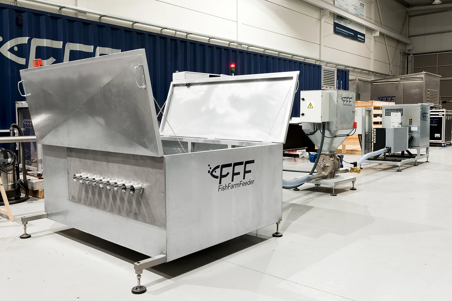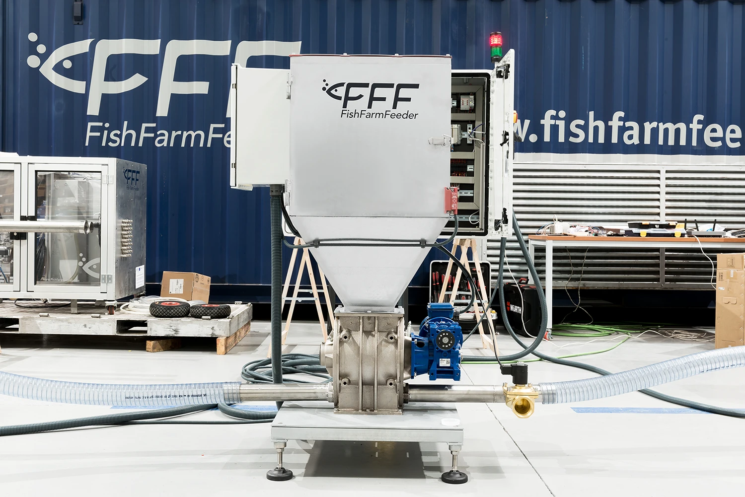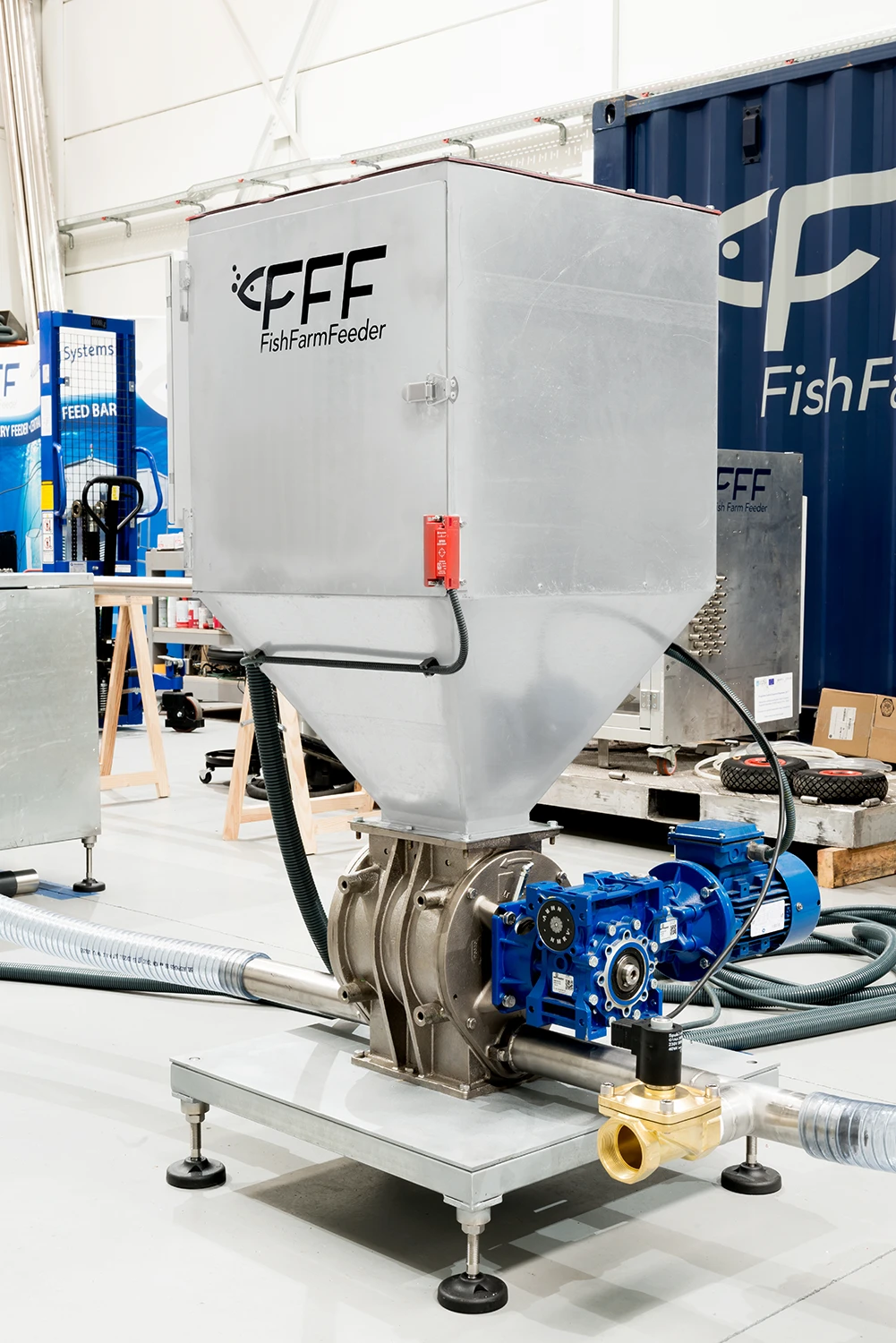 Feeding with extruded, pelletized, or spherized pellets. Custom-built in galvanized steel with 1 intermediate silo connected to high-capacity silos via included screw conveyors, supplied by other manufacturers. Diluted-phase feeding using a rotary lobe air blower. Aqua3F software for complete management of dosing, species and feed traceability, and feeding history.