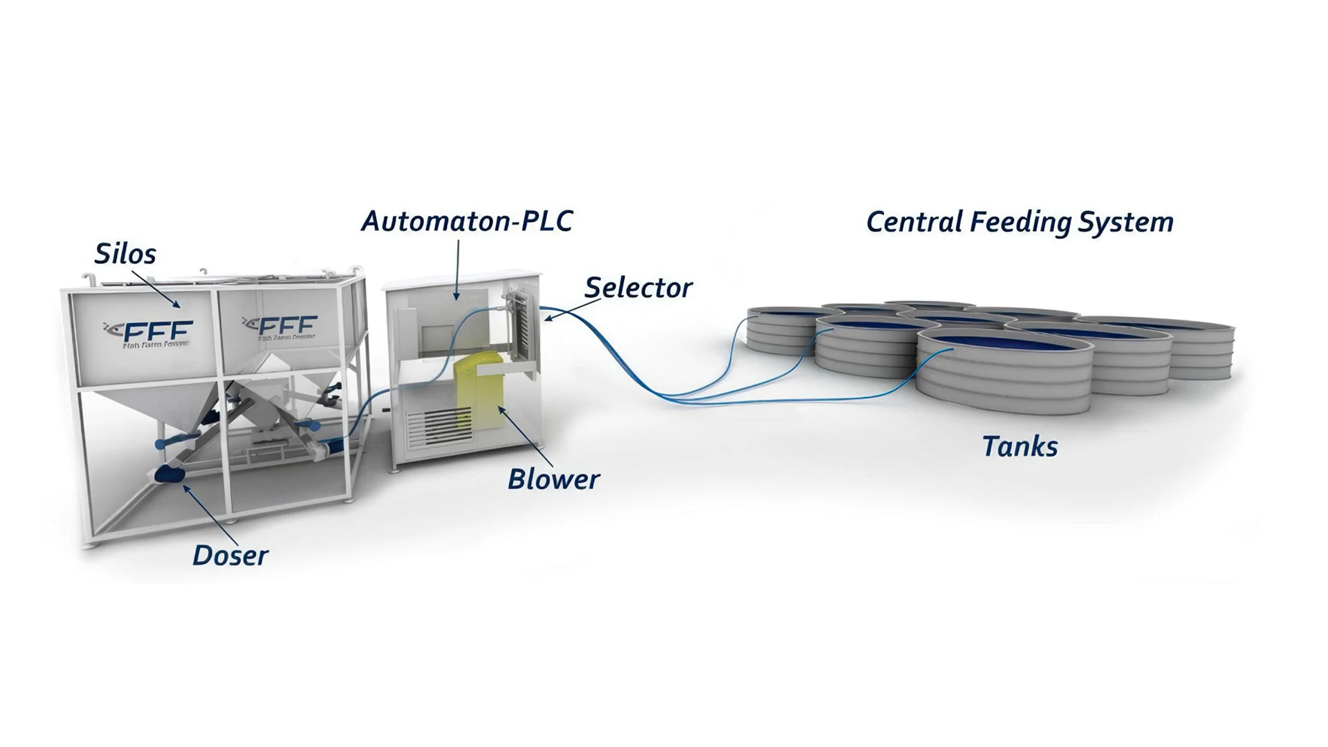Feeding with extruded, pelletized or spheronized pellets. Custom-built in galvanized steel with 4 silos totaling a capacity of 4 m³. High-precision dosing using screw conveyors sized according to the required doses. Diluted phase feeding with a rotary lobe air blower. Aqua3F software for complete dosing management, species and feed traceability, and feeding history. Custom design with an enclosed selector mounted on a structure, featuring pneumatic equipment at the bottom and a separate electrical control panel.