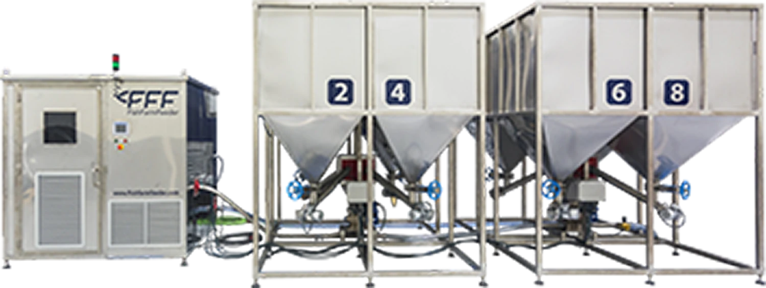Grow-out dry feed system with 8 silos of 2 m³ each for 80 tanks, including cabin and silos set