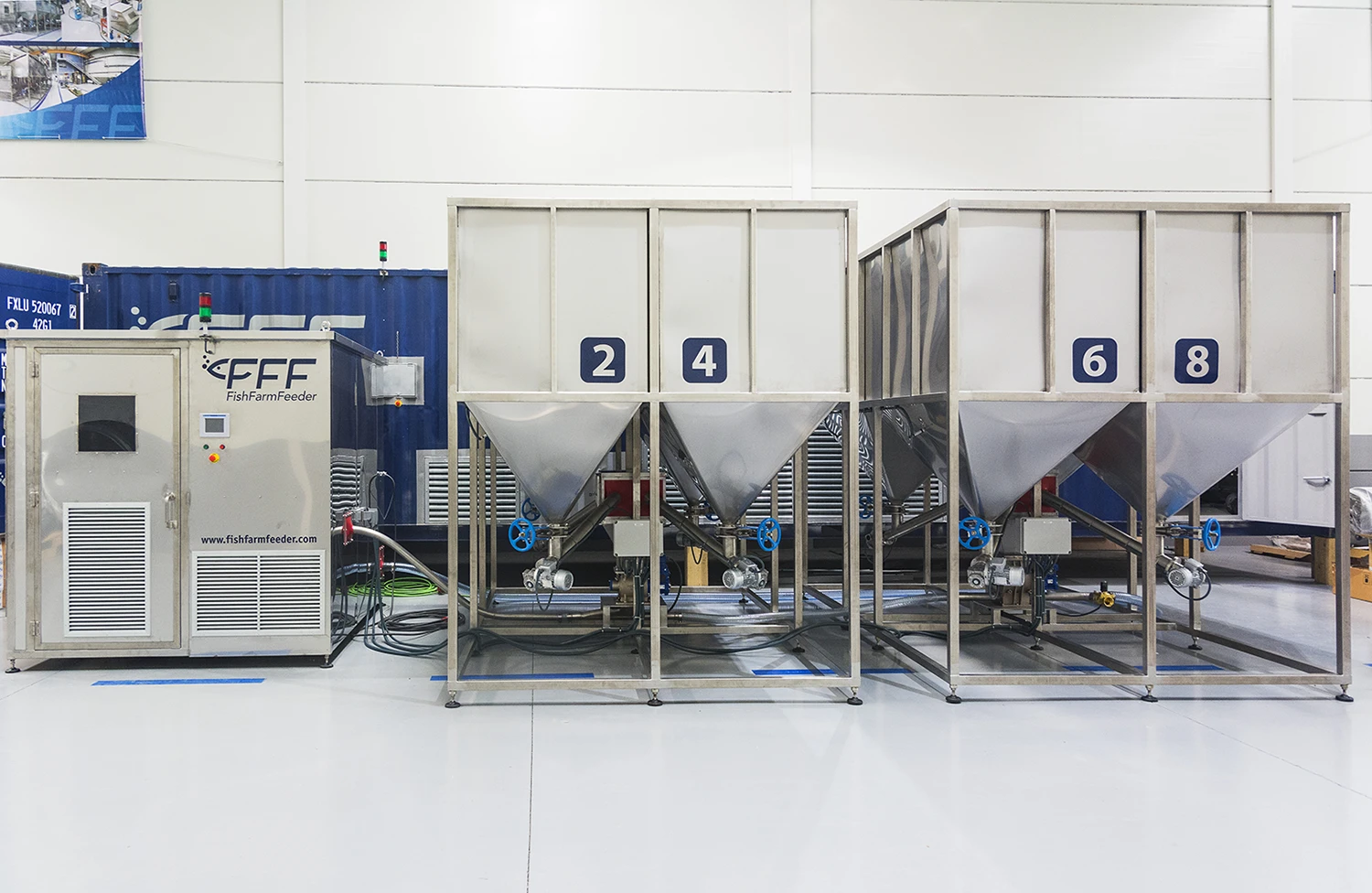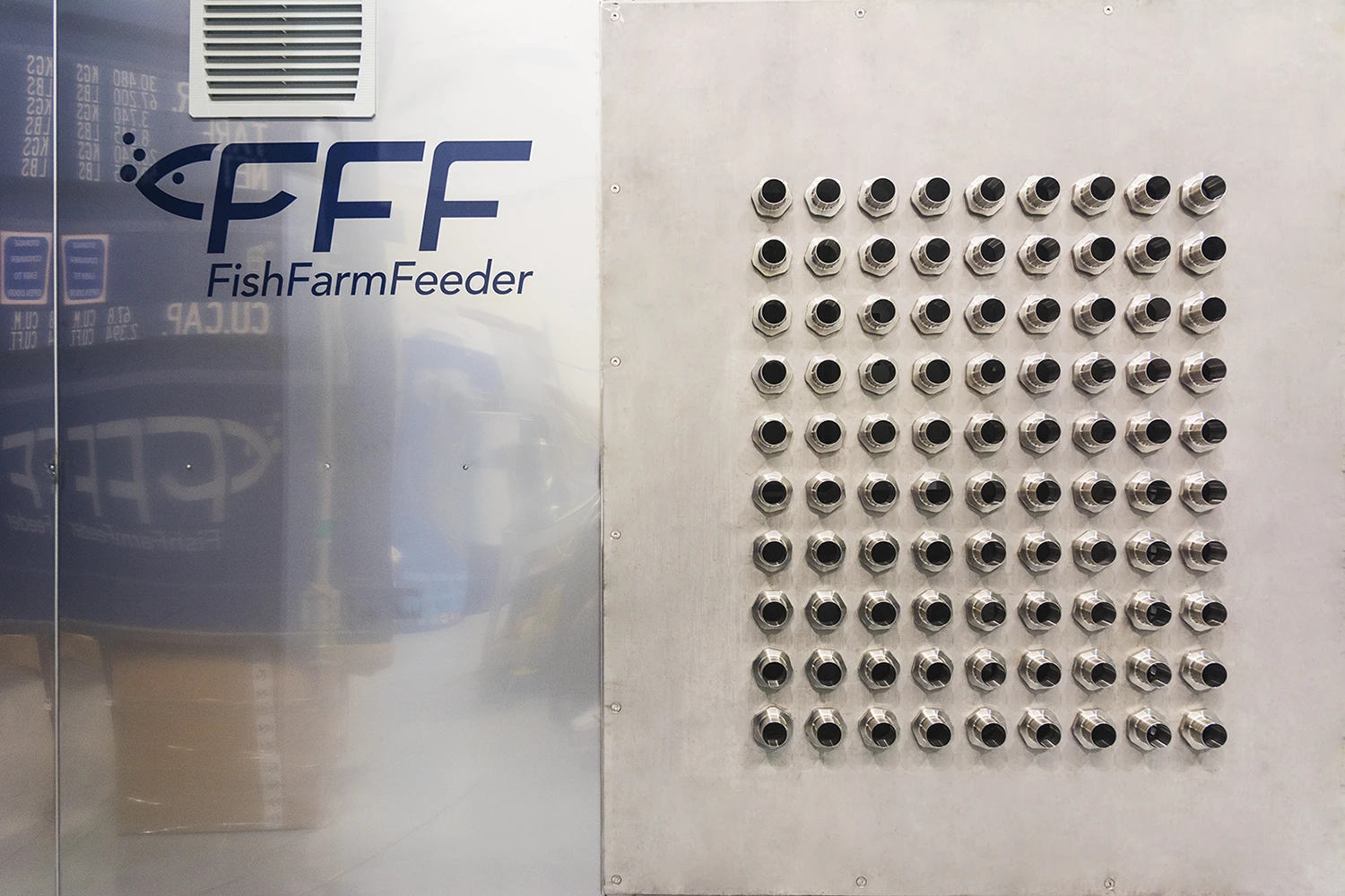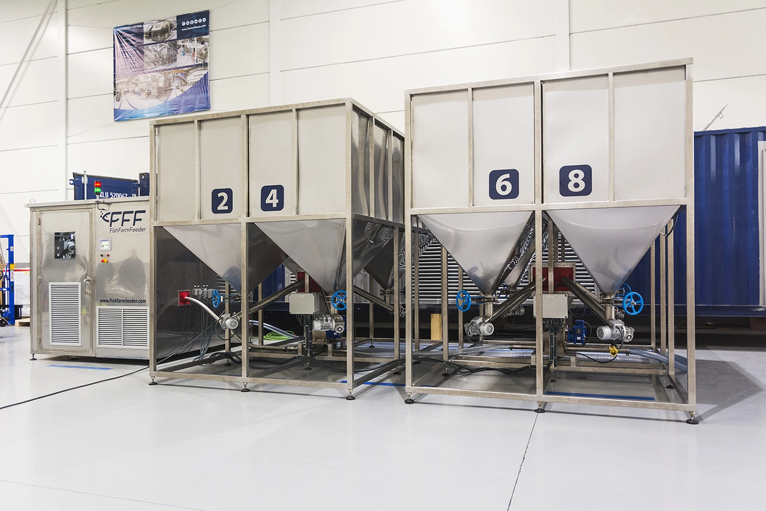 Feeding with extruded, pelletized, or spherized pellets. Custom-built in stainless steel with 12 silos offering a total capacity of 24 m³. High-precision dosing using screw feeders sized according to the required feed volumes. Diluted-phase feeding using a rotary lobe blower. Aqua3F software provides complete management of dosing, species and feed traceability, and feeding history.