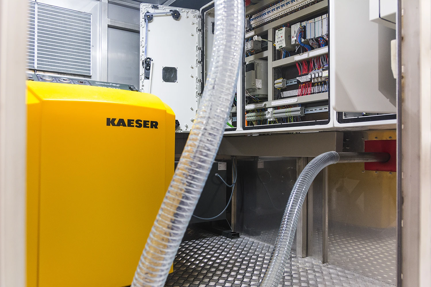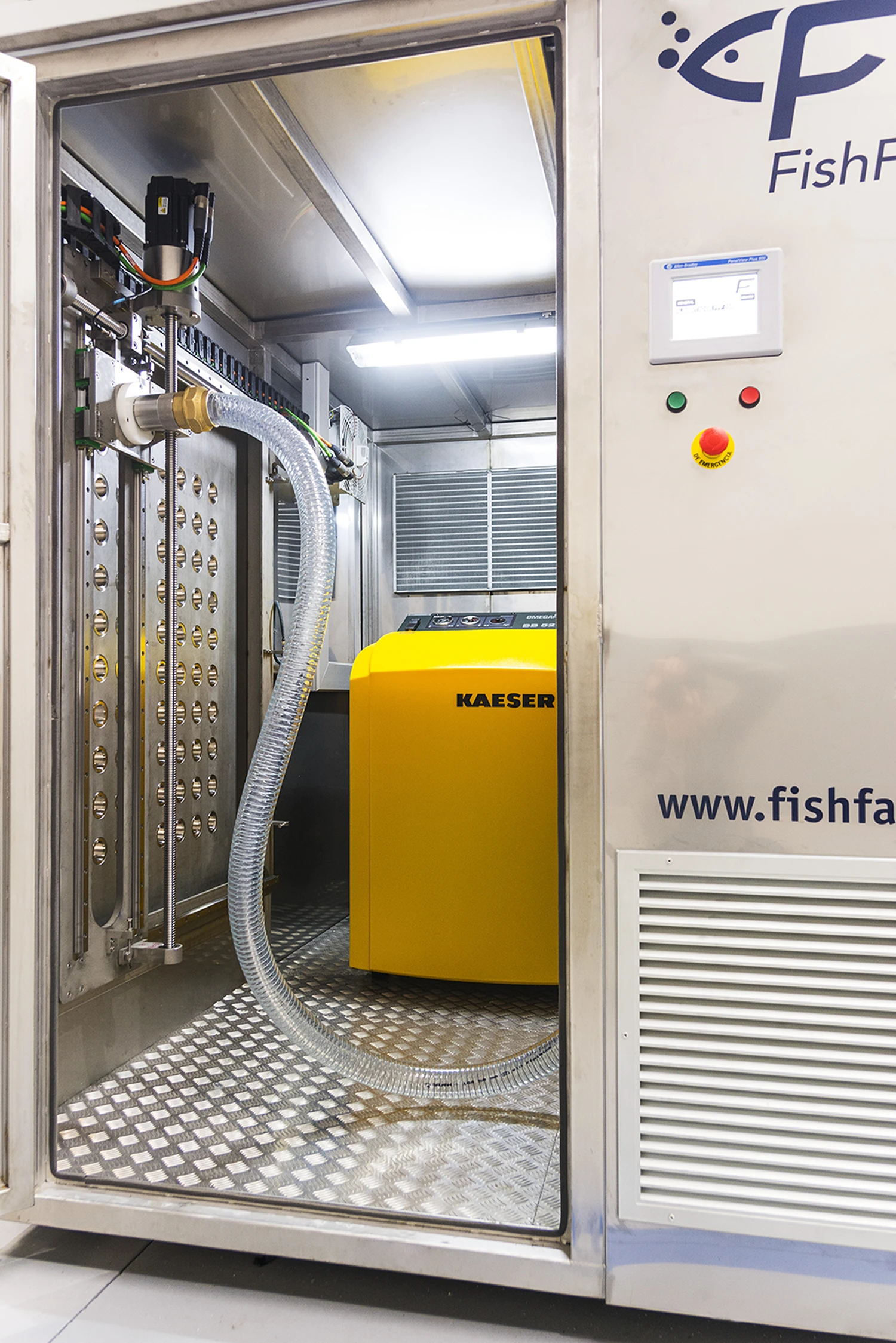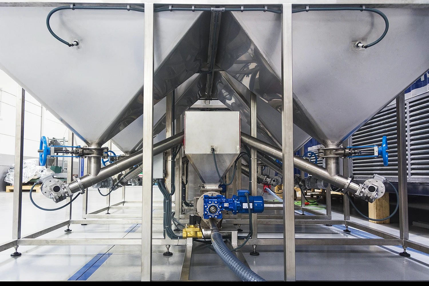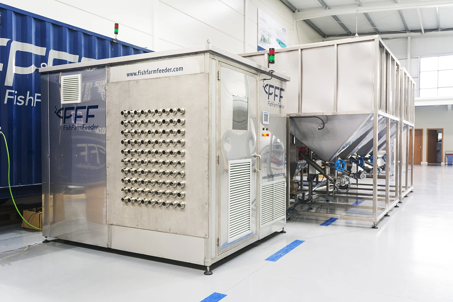 Feeding with extruded, pelletized, or spherized pellets. Custom-built in stainless steel with 12 silos offering a total capacity of 24 m³. High-precision dosing using screw feeders sized according to the required feed volumes. Diluted-phase feeding using a rotary lobe blower. Aqua3F software provides complete management of dosing, species and feed traceability, and feeding history.