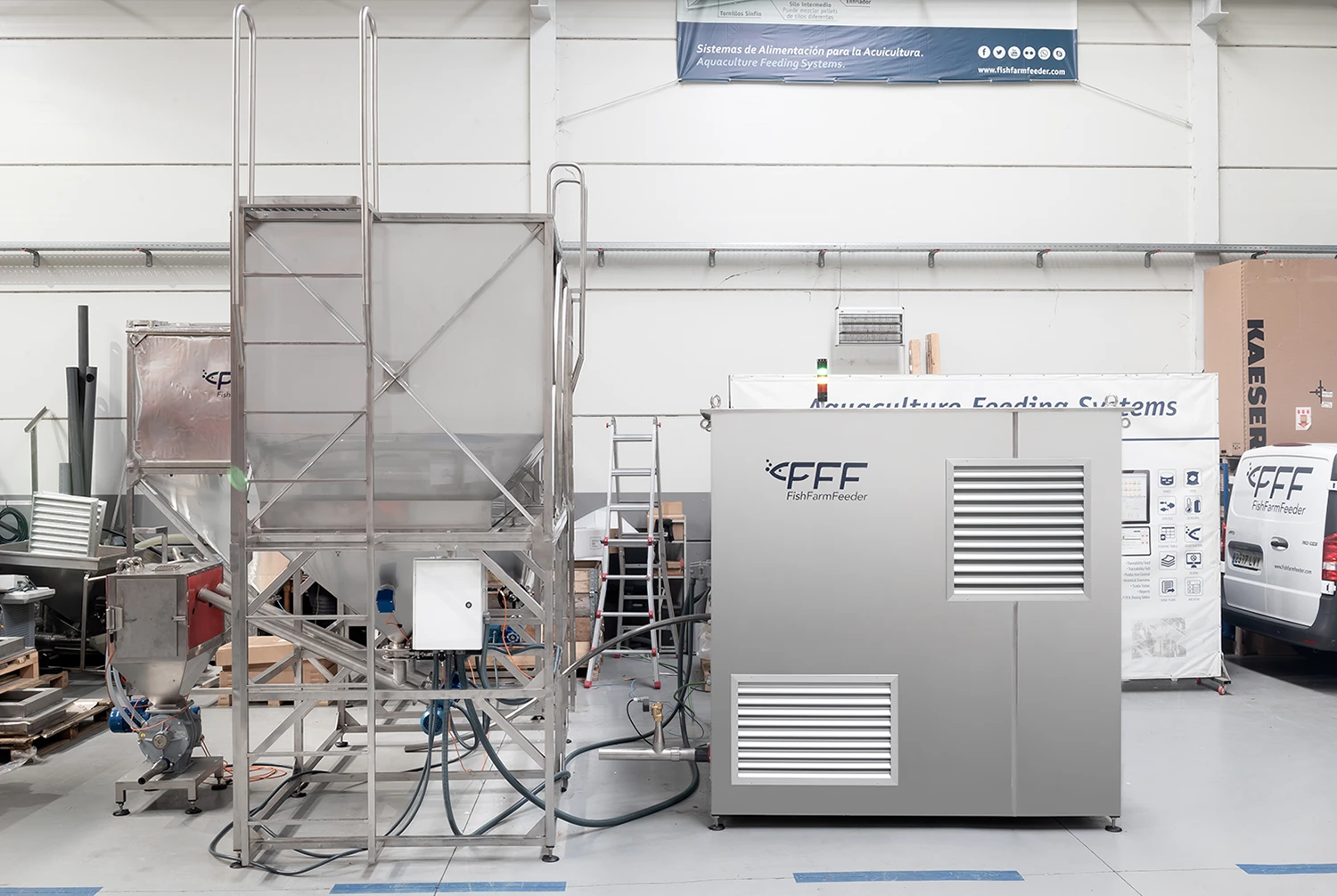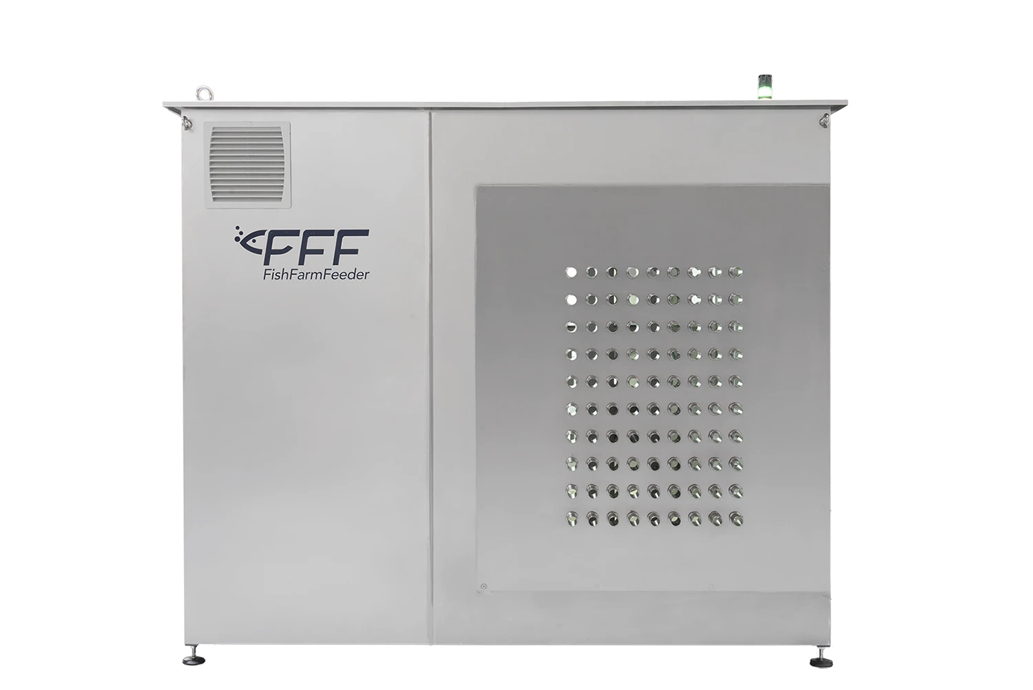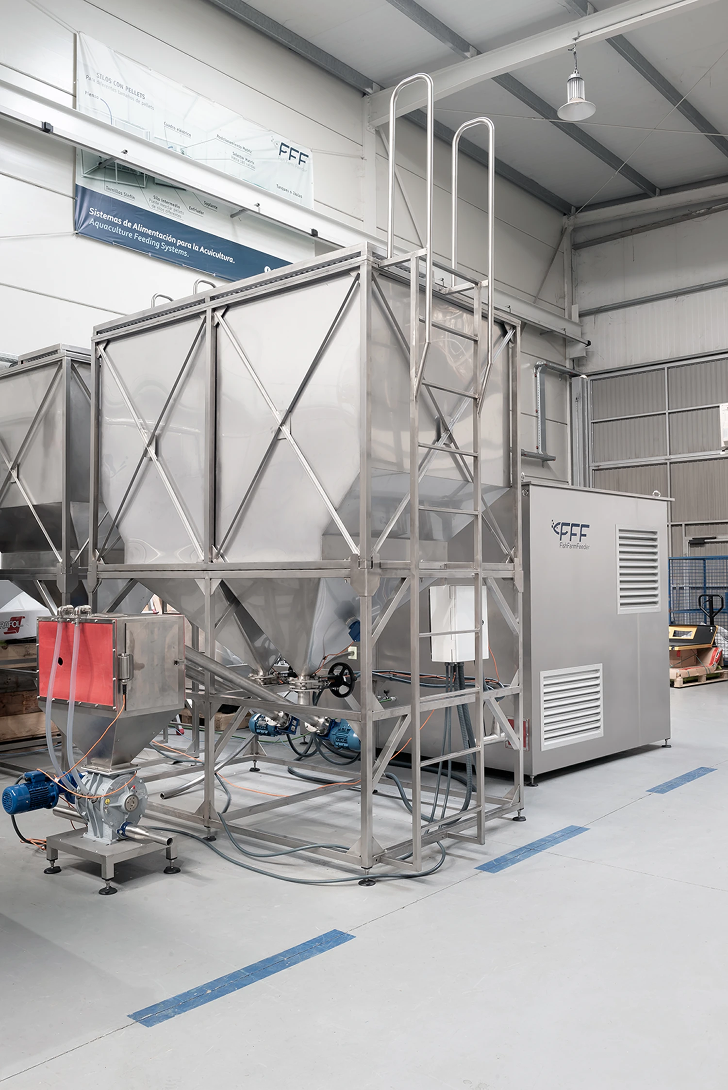 Feeding with extruded, pelletized, or spherized pellets. Custom-built in stainless steel with 4 silos offering a total capacity of 2 m³. High-precision dosing using screw feeders sized according to the required feed volumes. Diluted-phase feeding using a rotary lobe blower. Aqua3F software provides complete management of dosing, species and feed traceability, and feeding history.