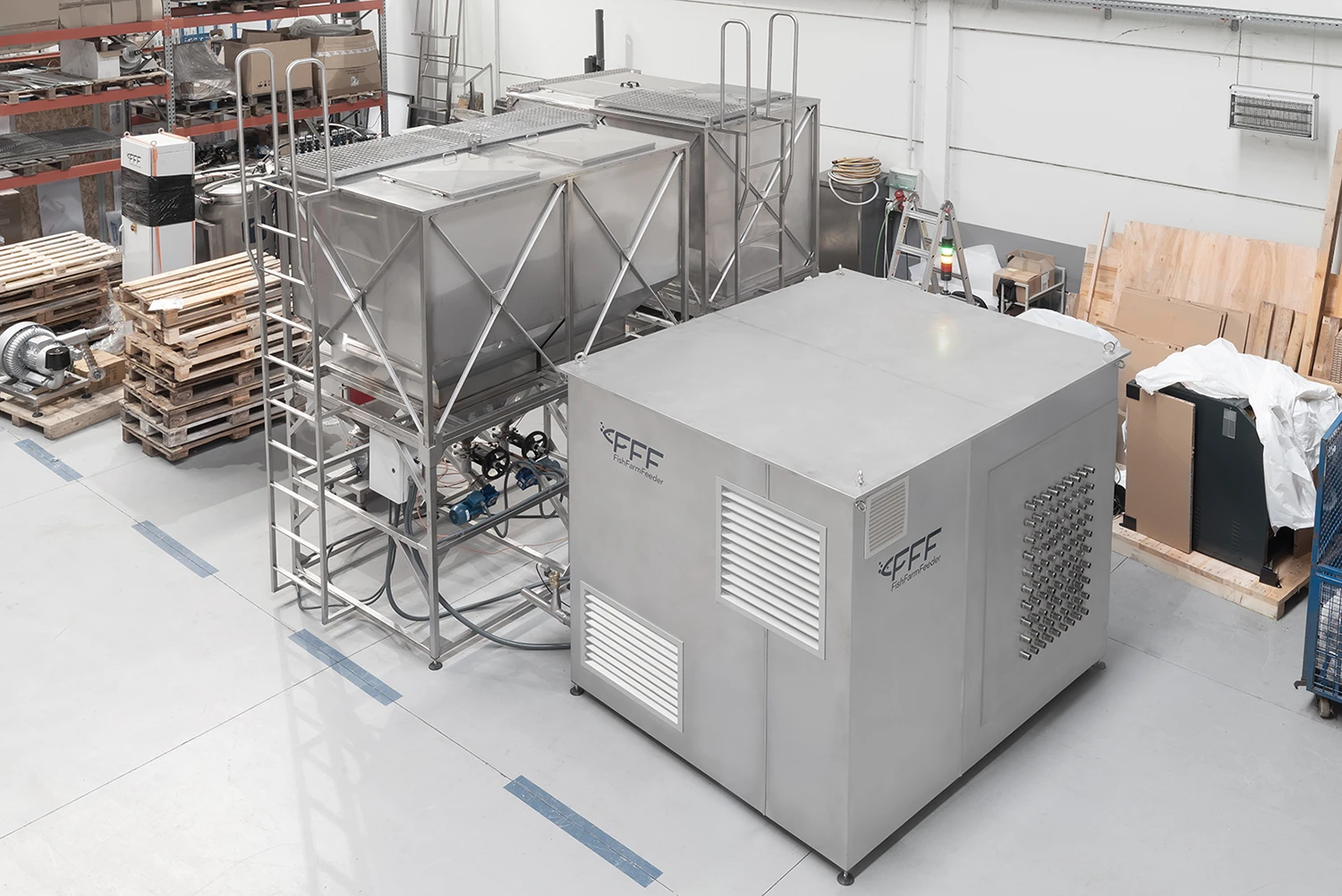Pre-grow dry feed system with 2 silos of 2 m³ for 80 tanks, including cabin and silos set