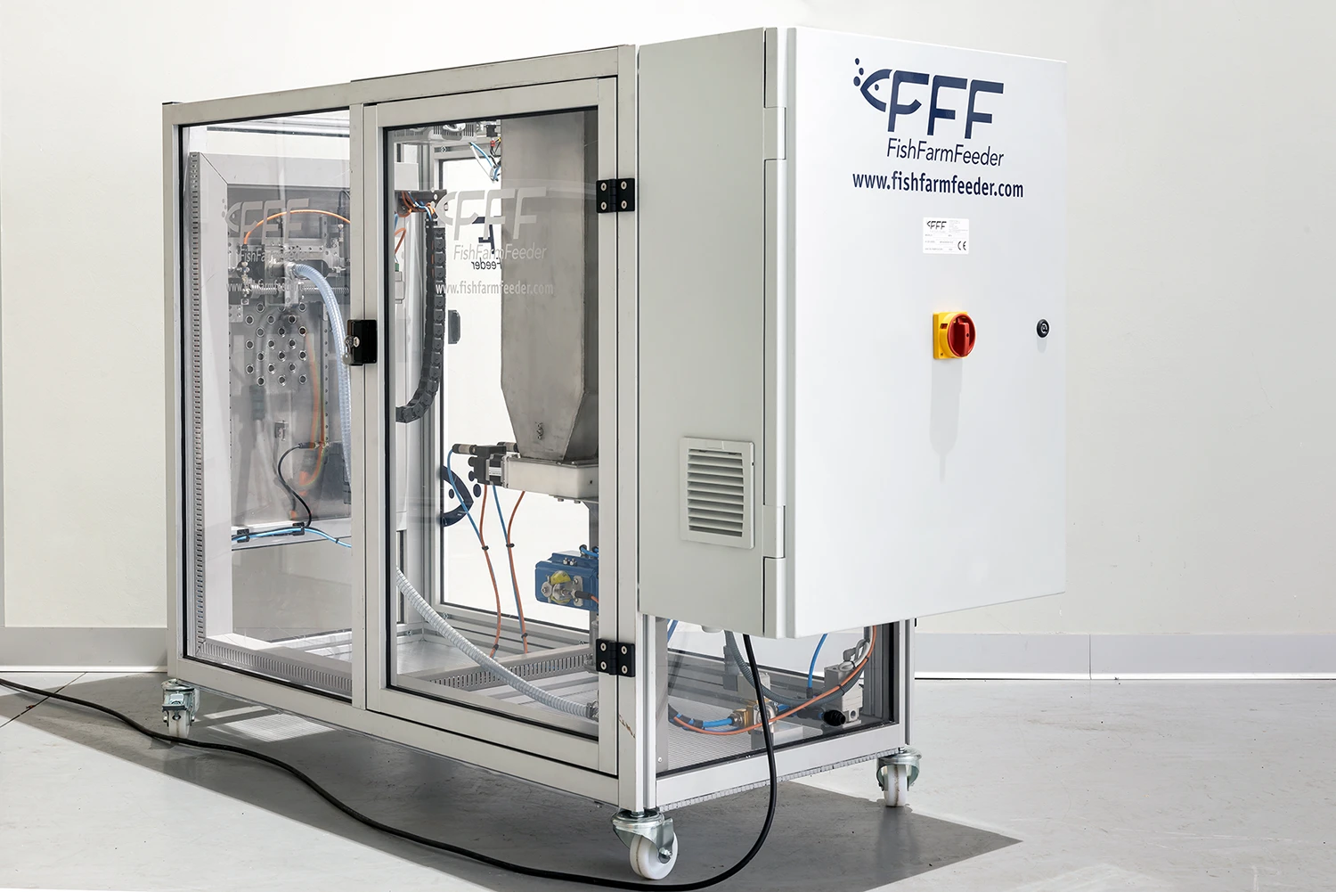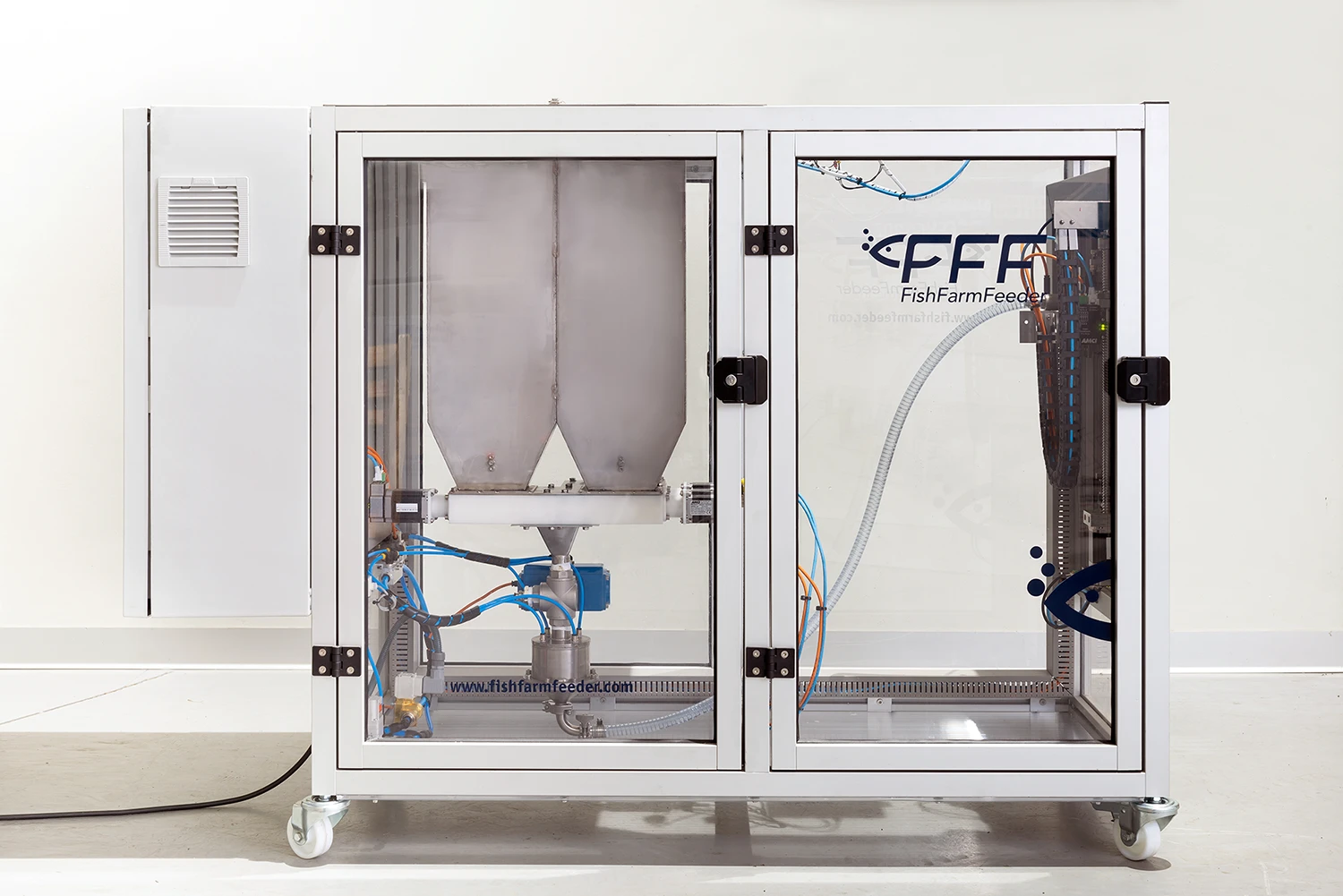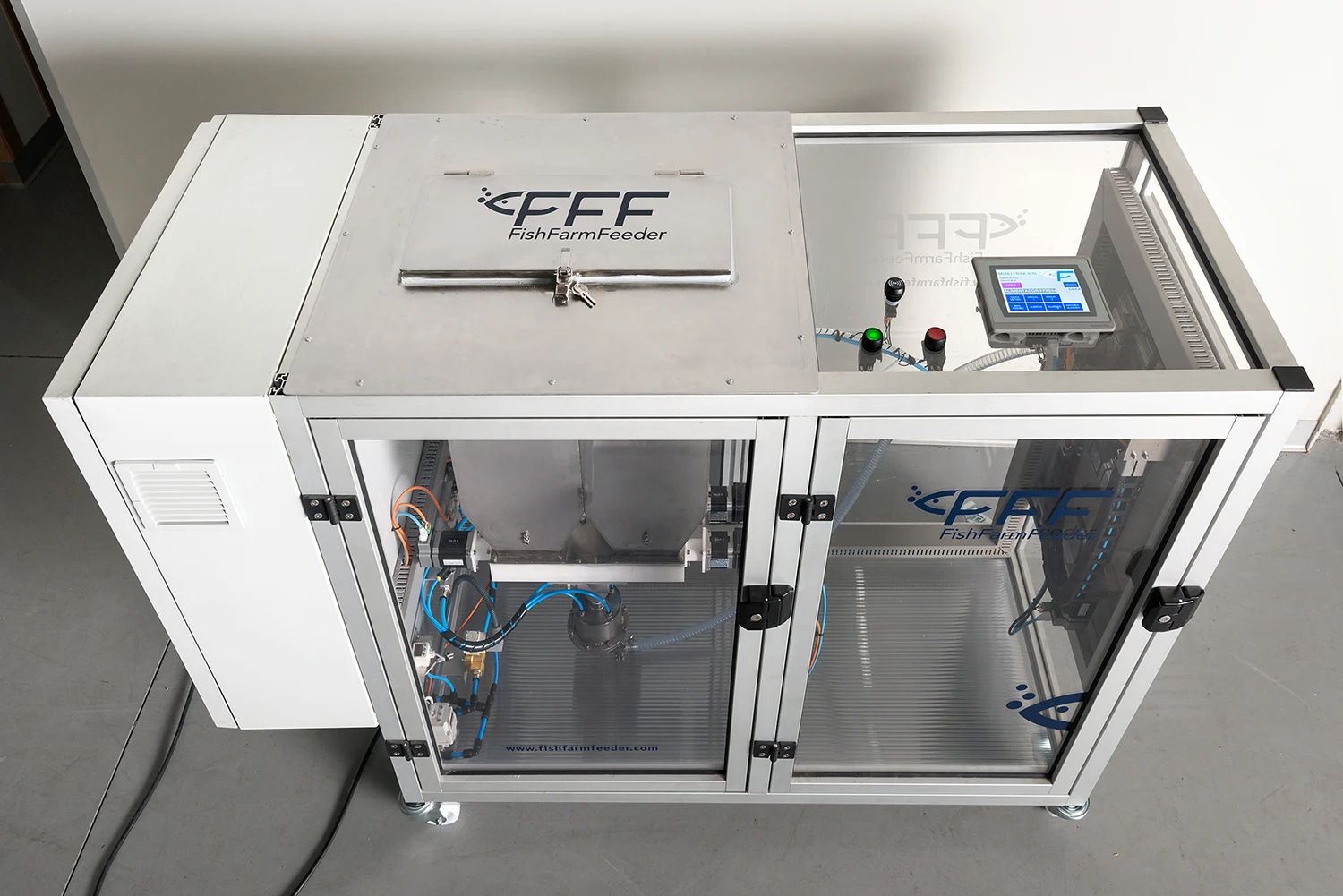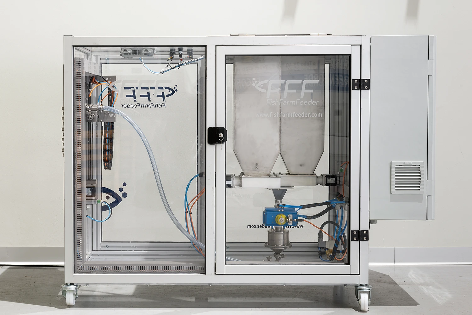 Alimentación con microdietas de pienso seco extrusionadas, peletizadas o esferizadas. Fabricación a medida en acero inoxidable y aluminio con 3 silos con capacidad para un total de 30Kg. Dosificación de alta precisión utilizando tornillo sinfín dimensionado acorde al tamaño de la dosificación. Alimentación en fase densa con dosis máximas individuales de 100 gramos utilizando compresor de aire. Software Aqua3F para una completa gestión de la dosificación, trazabilidad de la especie y el alimento e históricos de alimentación.